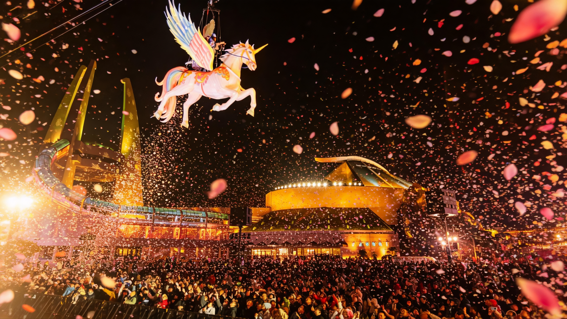 华东首个搭载AI科技的恐龙花灯“吉龙崽”取旅客趣味互动,翼展达60米的“天马拂晓”横跨金水桥,热闹的人气背后,漫天花雨倾泻而下,旅客们正在此猜灯谜、抽好礼?